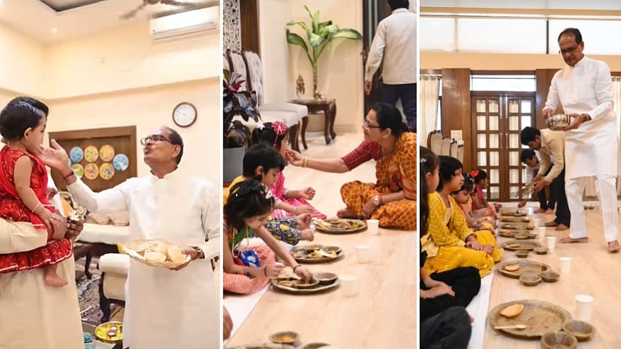 At his residence, Chouhan, along with his wife Sadhna Singh and family members, welcomed young girls and performed the rituals, which included aarti, tika, and flower offerings.
